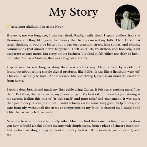 I made my first guide in Canva and to my surprise, I made my first sale that same week. I remember feeling a mix of disbelief, relief, and excitement all at once. For the first time, I realized I could create something valuable, help others, and earn honestly without the stress, the endless hours, or compromising my deen. That moment wasn’t just a sale, it was proof that I could finally build a life on my own terms, with integrity and purpose.
